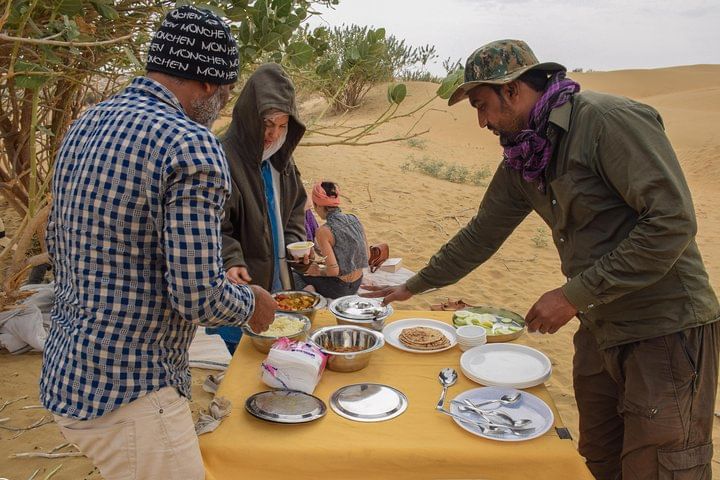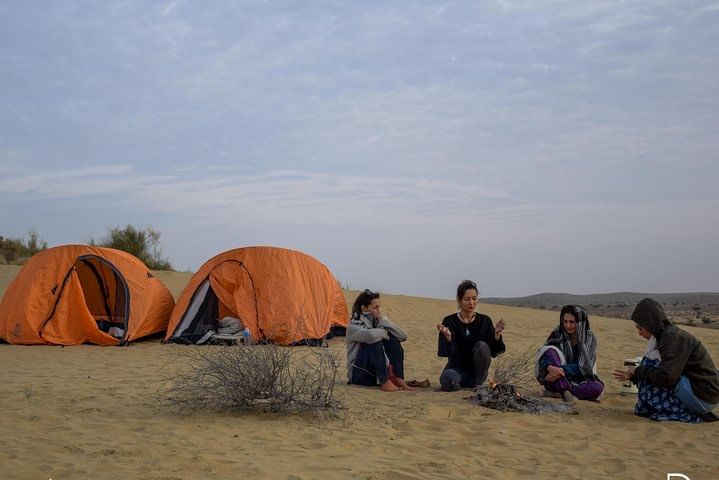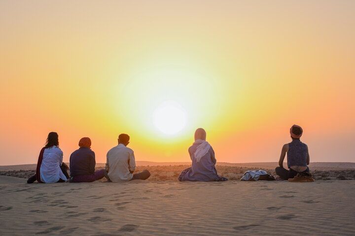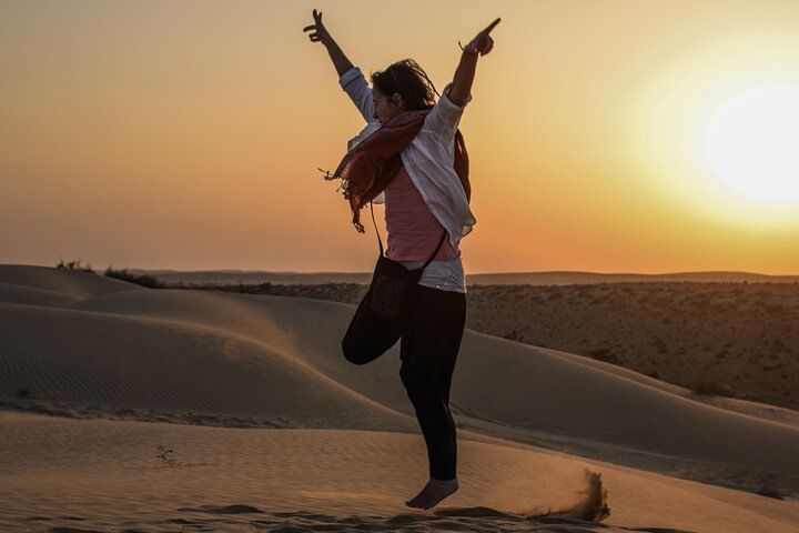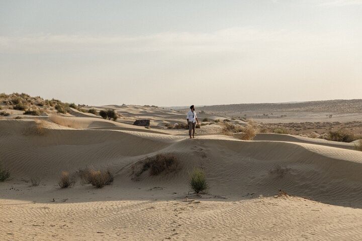 Discover the Thar Desert with a mindful retreat that goes beyond the typical Jaisalmer desert safari. No camel rides, no crowded camps — only silence, connection, and authenticity. Travel by jeep through Desert National Park to spot antelopes, camels, and desert birds before arriving at peaceful golden dunes. Visit a desert village, meet local families and children, and learn about their way of life. As the sun sets, join a guided silent walk and meditation on the dunes. Later, gather around a fire to enjoy a traditional vegetarian dinner cooked fresh in the open, with the option of a Rajasthani folk music and dance performance. Under the desert’s clear night sky, experience breathtaking stargazing of constellations and the Milky Way. Choose your ending: return to Jaisalmer after dinner, stay overnight in a luxury desert tent, or sleep under the stars on comfortable bedding. Wake to sunrise meditation and chai. A soulful desert retreat in Rajasthan.
